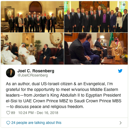 Rosenberg, himself an evangelical Christian, has written a number of political thrillers on the Middle East, including one in which ISIS conquers Jordan and another focusing on Iran’s war efforts in the region. None of his books, however, has featured a scene in which an Israeli citizen sits next to the Saudi crown prince. Something like that could only happen in real life.